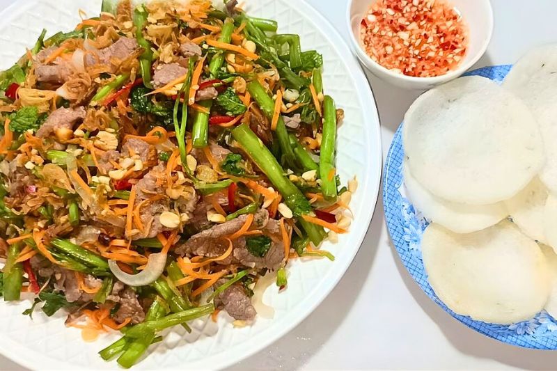 Le nom rau muong thit bo est une salade vietnamienne savoureuse préparée avec des tiges de liseron d’eau (rau muong) légèrement blanchies et du bœuf tendre finement tranché. Les ingrédients sont mélangés avec des herbes aromatiques, de l’ail frit et des cacahuètes grillées, puis assaisonnés avec une sauce légèrement acidulée à base de nuoc mam, de citron vert et de sucre. Cette salade se distingue par sa texture croquante et son goût frais, très apprécié dans la cuisine vietnamienne.