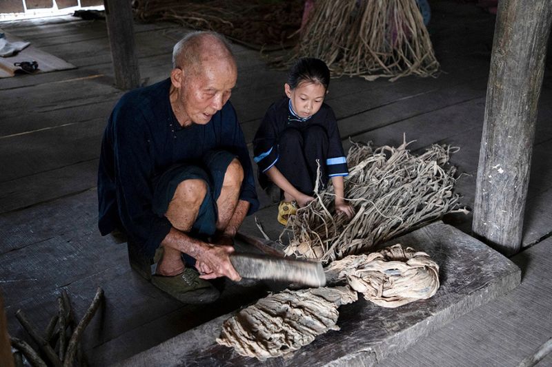 Le giay ban a longtemps accompagné les moments importants de la vie villageoise. On l’utilisait pour écrire, pour décorer l’intérieur des maisons, et surtout pour les rituels : offrandes aux ancêtres, papier votif, caractères sacrés tracés à l’encre noire. Cet usage spirituel n’a jamais vraiment disparu, et c’est en partie ce qui maintient la production aujourd’hui. Comme partout dans le Vietnam rural, le métier traverse pourtant des temps difficiles. Les jeunes quittent le village pour Hanoi ou Cao Bang, attirés par des emplois plus stables et mieux payés. Le papier industriel, moins cher et plus uniforme, gagne du terrain sur le marché local. L’arbre May Sla, même s’il pousse encore en abondance dans les forêts environnantes, subit une pression qui inquiète les anciens. Les quarante familles qui continuent de fabriquer le papier ban le font autant par fidélité à leurs parents que par attachement à un savoir-faire qu’elles ne veulent pas voir s’éteindre.