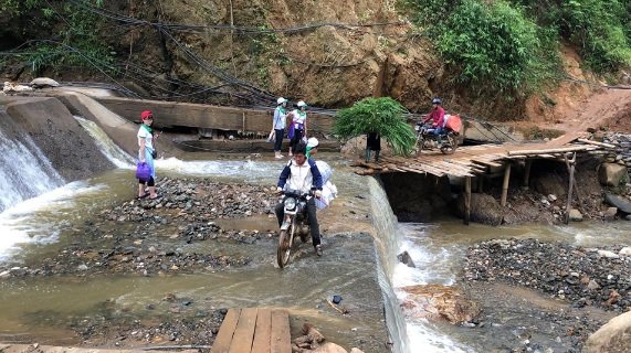 C’est après une dizaine heures de trajet, sur des routes vraiment cabossées que nous sommes arrivés au pied du village. Le lieu n’étant accessible qu’à pied ou en moto nous prévoyons de repartir le lendemain à 5h30 du matin pour randonner et charger les fournitures sur les motos!