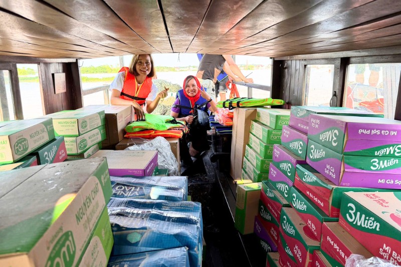 Les images des paysages temporairement inondés et des habitants unis pour protéger leurs foyers ont touché le cœur de tout le pays. Mais très vite, face à la détresse, la solidarité a pris le relais. Partout, des appels à l’aide se sont multipliés, et à Hanoï, de nombreux groupes de bénévoles se sont organisés pour faire parvenir vivres et produits essentiels dans les zones sinistrées. C’est dans cet élan collectif qu’Horizon Vietnam Travel s’est mobilisé. Fidèle à son esprit de partage et à son engagement envers les communautés locales, notre équipe a uni ses forces avec plusieurs associations de bénévoles pour organiser sept voyages humanitaires vers les régions touchées. Ces missions, souvent réalisées dans des conditions difficiles, ont permis de livrer des milliers de colis de première nécessité : eau potable, pain, nouilles, lait, saucisses et autres produits essentiels.